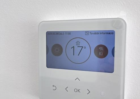 A ház fűtését hőszivattyú, míg a hűtését központi fancoil klímák látják el, és ahhoz, hogy az áramszámla alacsony maradjon, az 5kw-os, szaldós napelemrendszer járul hozzá. A fűtést minden helyiségben padlófűtés végzi. A meleg benntartását segíti a falazat 15 cm-es grafit-, és a födém 30 cm-es üveggyapot szigetelése.