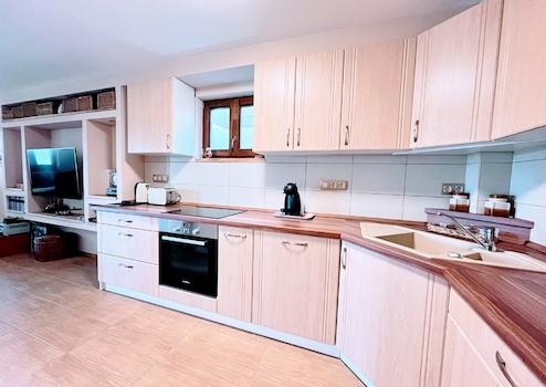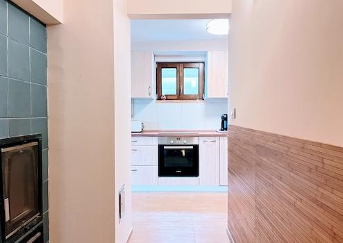 Im gesamten Hausbereich gibt es eine Fußbodenheizung, die über einen zentralen Elektrokessel (nachts mit Strom) mit Wärme versorgt wird. Auf der unteren Ebene lässt sich die Heizung per App fernsteuern. Ebenfalls auf der unteren Ebene finden wir den Kachelofen, der an Wintertagen für wohlige Wärme sorgt.