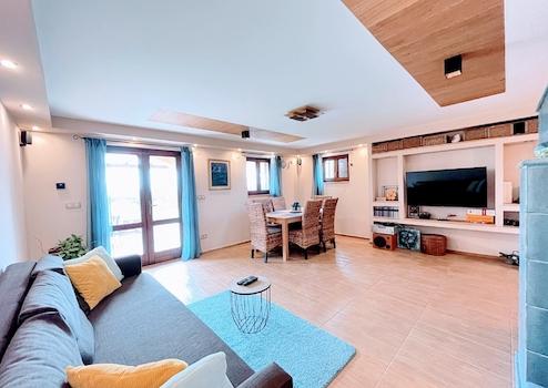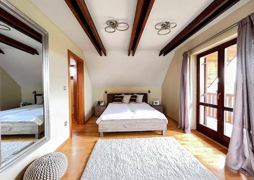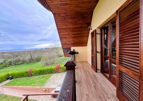 A felső szinten egy nagyobb előtér, és két háló van, melyből a nagyobb szintén erkélykapcsolatos, és innen tárul elénk a ház legszebb panorámája.