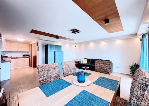 A középső szintre akár a belső lépcsőn is felmehetünk, de az utcaszintről is beléphetünk egy külön bejáraton. Itt egy további gyönyörű, erkélykapcsolatos, panorámás háló, nagy fürdő, külön wc, és egy kis gardrób található.