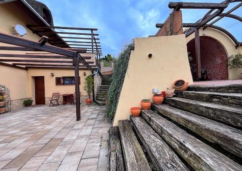 Látszik, hogy a külső tér kialakításánál cél volt, hogy minél több időt lehessen a szabadban tölteni, élvezve a csodás kilátást, a jó levegőt és a természet közelségét. A ház alsó szintje előtt egy nagy terasz lehet a család kedvenc helye, melyet pergola véd a melegtől. Innen pár lépés - melyből néhányat egy nagyon egyedi, fagerendákból kialakított lépcsőn teszünk meg - a borospince terasza. A 6x3-as borospince fedett “folytatása” a végén nyitott rész, mely egy árammal, vízzel ellátott teljes értékű nyári konyhát is rejt - tippünk szerint itt történnek majd a legjobb kerti összejövetelek.