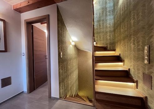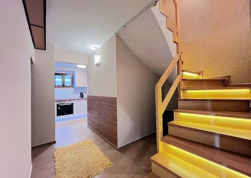 Itt ami fának látszik, az fa; bambusz, mogyoró, lilaakác, tölgy és kőris. A belső lépcső szintén kőrisfa. A bútorok többsége egyedi, ide tervezett, minőségi darab, ezek nyilván igény szerint maradhatnak. A világítás szintén említést érdemel, hiszen átgondolt, hangulatos lámpákat találunk mindenhol, a mi kedvencünk a lépcső hangulatvilágítása.