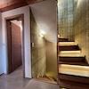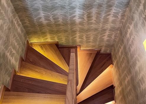 Was hier wie Holz aussieht, ist Holz; Bambus, Haselnuss, Flieder, Eiche und Esche. Auch die Innentreppe besteht aus Eschenholz. Bei den meisten Möbeln handelt es sich um einzigartige, hier entworfene, hochwertige Stücke, die selbstverständlich je nach Bedarf erhalten bleiben können. Erwähnenswert ist auch die Beleuchtung, denn überall finden wir durchdachte, stimmungsvolle Lampen, unser Favorit ist die stimmungsvolle Beleuchtung der Treppe.