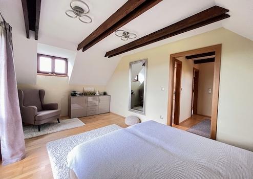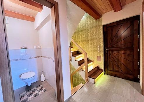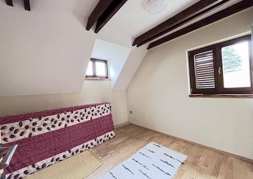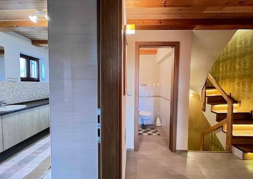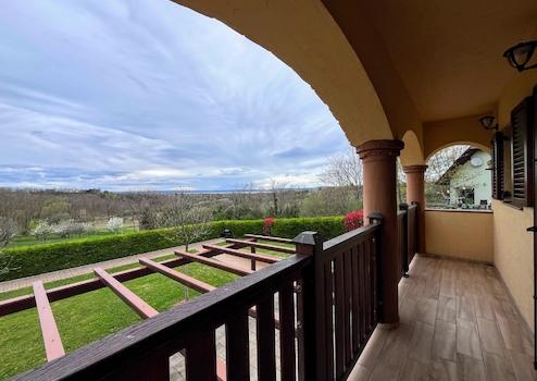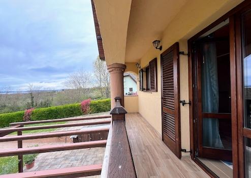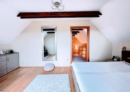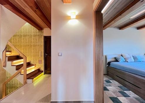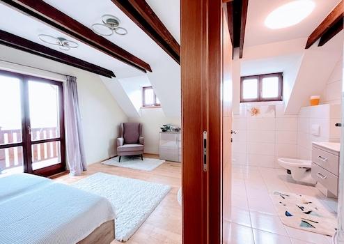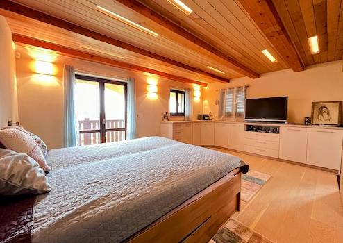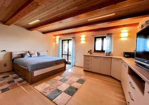 Auf der oberen Ebene befinden sich ein größerer Vorraum und zwei Schlafzimmer, von denen das größere auch über einen Balkon verfügt, und von hier aus eröffnet sich uns das schönste Panorama des Hauses.