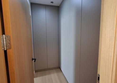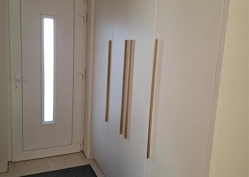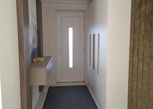 Az egyállásos garázsból közvetlenül az előszobába jutunk, innen nyílik egy vendég toalett kézmosóval, illetve egy külön háztartási helyiség. Az előszobában egy nagyméretű beépített szekrény lett kialakítva. Itt minden cipő, kabát helyet kaphat, így rendezett és elegáns marad az előszoba.