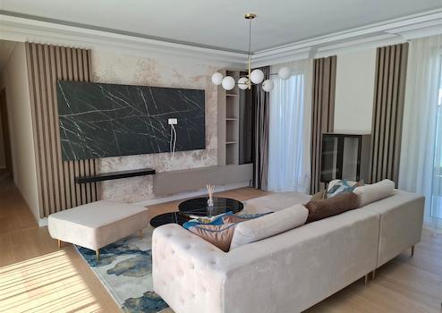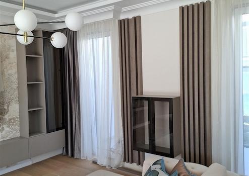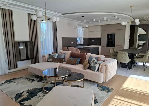 Vom Vorraum gelangt man in das geräumige Wohnzimmer mit offener Küche. Die Küche ist modern und verfügt über viel Stauraum. Dank der großen Fensterfronten des Wohnzimmers ist dieser Wohnbereich sehr hell. Die Deckenverkleidung aus Karton und die versteckte LED-Stimmungsbeleuchtung machen die Atmosphäre noch angenehmer und gemütlicher.