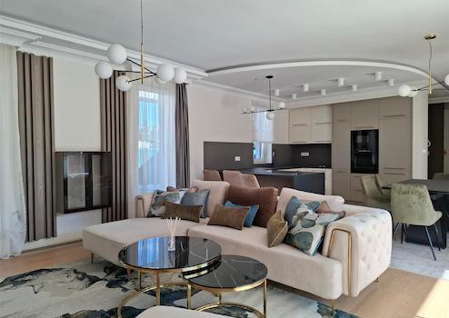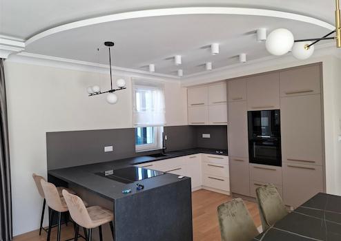 Az előszobából a tágas amerikai konyhás nappaliba érkezünk. A konyha modern és rengeteg tárolási lehetőséggel rendelkezik. A nappali nagy nyílászáróinak köszönhetően ez az élettér nagyon világos. A mennyezeti látvány kartonozás, rejtett LED hangulatvilágítással még kellemesebbe, hangulatosabbá teszi a légkört.