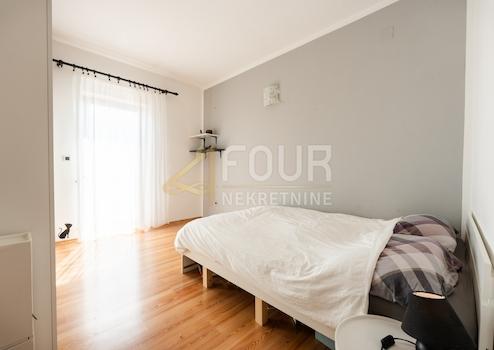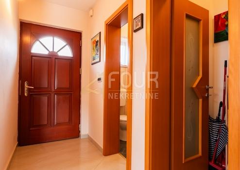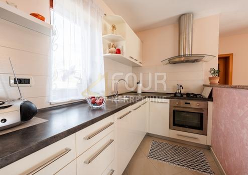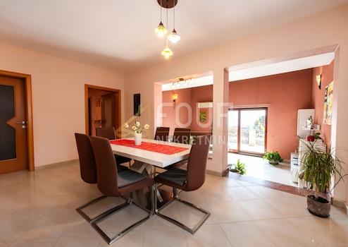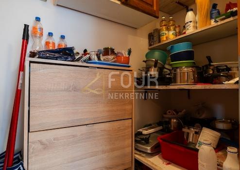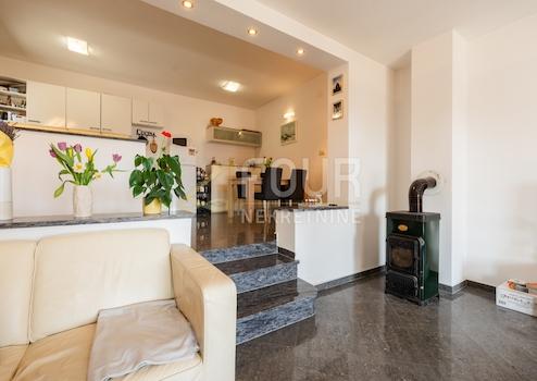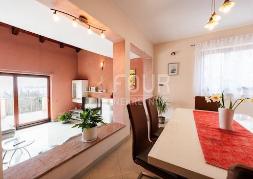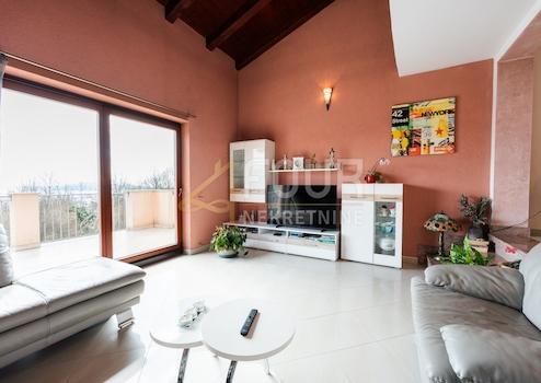 Im ersten Stock befindet sich eine geräumige Wohnung mit drei Schlafzimmern, einem Wohnzimmer, einer Küche, einem Esszimmer, zwei Badezimmern, einem Lagerraum, einem Balkon und einer Terrasse mit herrlichem Blick auf die Kvarner Bucht.