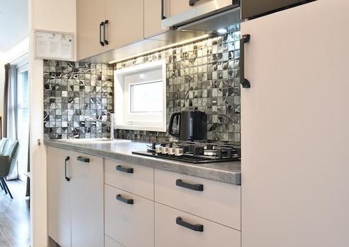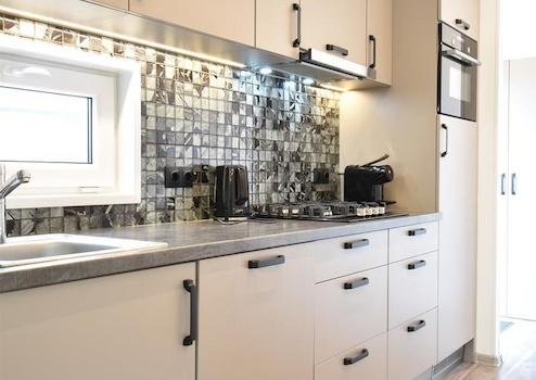 Die Küche ist mit einem 4-Flammen-Gasherd ausgestattet, auf dem Sie köstliche Mahlzeiten zubereiten können. Über dem Kühlschrank befindet sich eine Kombi-Mikrowelle, die sowohl als Backofen als auch als Mikrowelle genutzt werden kann, so dass Sie vielseitig kochen und backen können.