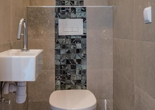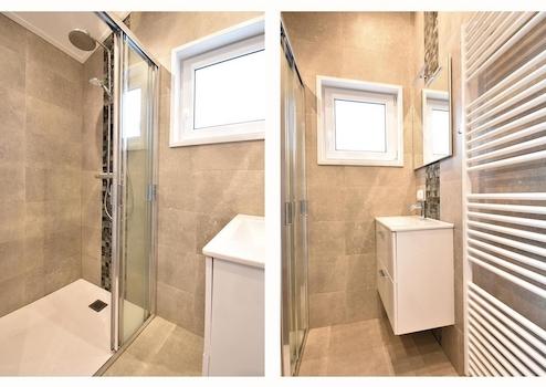Das Badezimmer ist modern und stilvoll eingerichtet und bietet alles, was Sie für ein komfortables und entspannendes Erlebnis benötigen. Das Herzstück des Raums ist die geräumige Dusche, die sowohl mit einer luxuriösen Regendusche als auch mit einer praktischen Handbrause ausgestattet ist. Diese Kombination sorgt dafür, dass Sie ein belebendes Duscherlebnis ganz nach Ihrem Geschmack genießen können.