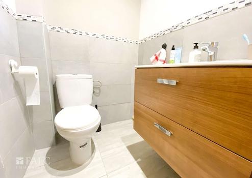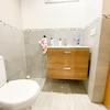 Die Wohnung verfügt über zwei moderne Badezimmer, die beide mit eleganten Steinfliesen ausgestattet sind. Die Bäder sind geräumig und verfügen jeweils über eine Dusche und eine Badewanne, wodurch sie zu einem idealen Ort zum Entspannen und Erholen werden.