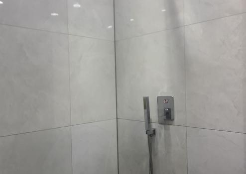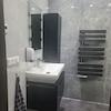 geräumiges gefliestes Bad mit Waschbecken und begehbarer Dusche