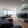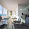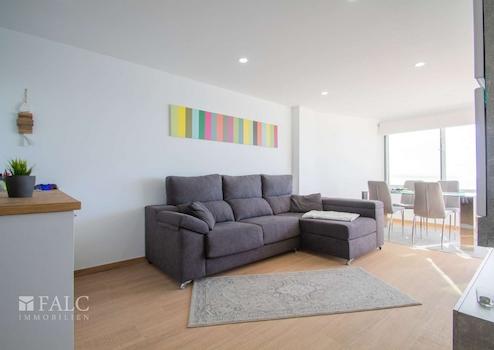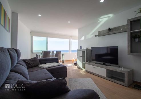 Die Wohnung verfügt über ein großes, geschmackvoll eingerichtetes Wohnzimmer mit hochwertigen Materialien und modernem Design. Die verglaste Terrasse erstreckt sich entlang der Wohnzimmerfront und bietet einen spektakulären Blick auf das Meer. Die Glasfronten können geöffnet werden, um eine nahtlose Verbindung zwischen Innen- und Außenbereich zu schaffen.
