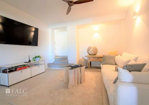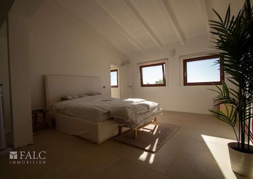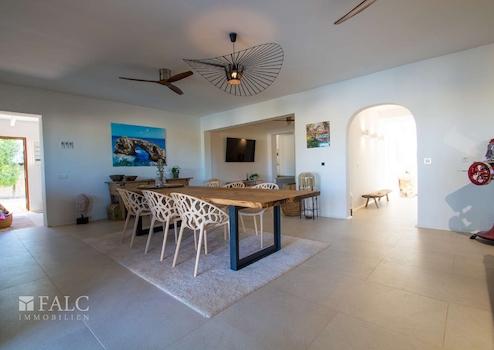 Die Wohnfläche von knapp 300 m² umfasst einen geräumigen Wohn- und Essraum mit ca. 50 m² Fläche, eine offene Einbauküche, fünf Schlafzimmer, ein Arbeitszimmer, ein Ankleidezimmer. Außerdem gibt es neben einem Gäste-WC noch zwei Badezimmer, davon eins en Suite. Um das Haus herum wurden mehrere Terrassen angelegt, wobei die Hauptterrasse überdacht ist und im Sommer angenehmen Schatten spendet.