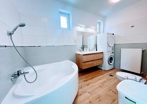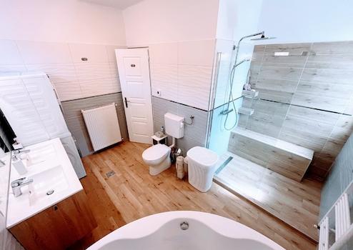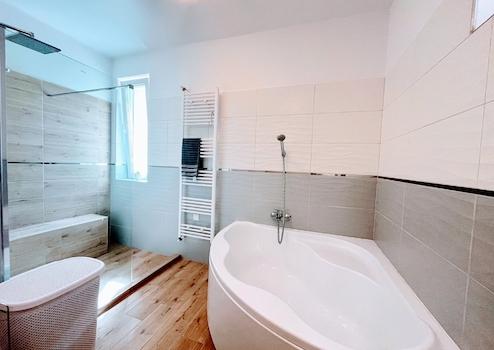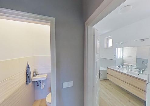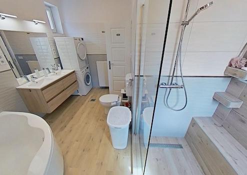 A nagyméretű fürdőben helyett kapott egy gyönyörű, erdei kilátással rendelkező zuhanyzó, egy sarokkád, wc, valamint egy dupla mosdó is. Természetesen egy külön wc is rendelkezésre áll még. A házban az összes szaniter minőségi, Hansgrohe termék.