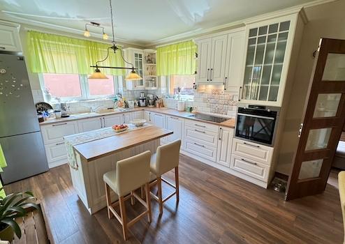 A klasszikus stílusban berendezett otthon, örök eleganciát adó bútorait az egyedi igényeknek megfelelően asztalos készítette. Rengeteg a beépített bútor, ezek a vételár részét képezik. A szobákba laminált parketta, míg a többi helyiségbe kerámiaburkolat került.