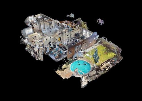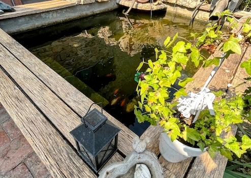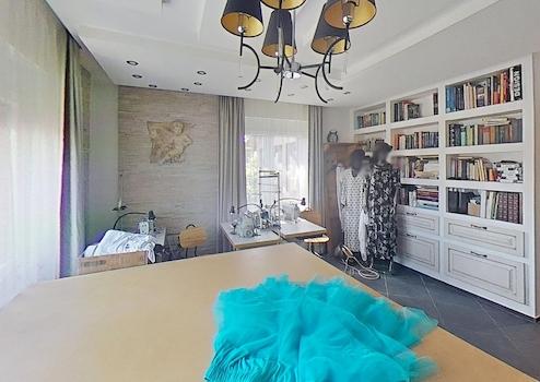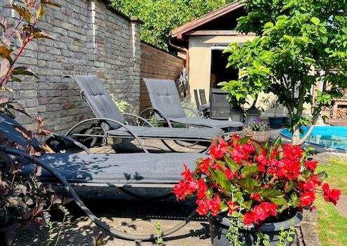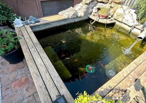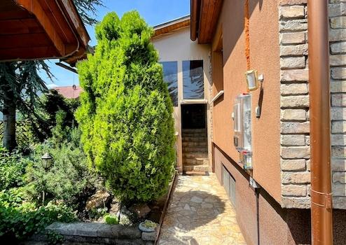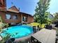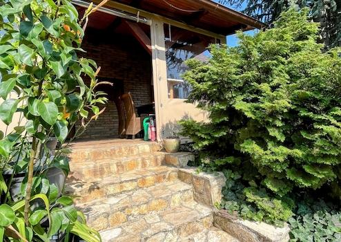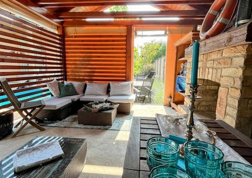 A ház főbejárata egy nagy 30 nm-es teraszról nyílik, melyen akár rossz időben is használható. A medence mellett még egy nagy, 30 nm-es terasz van, melyben egy működő kandalló is helyet kapott. A medencéhez sportoláshoz alkalmas áramoltató is jár.