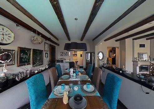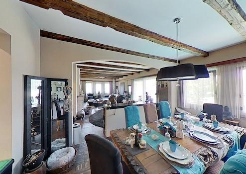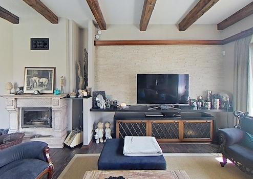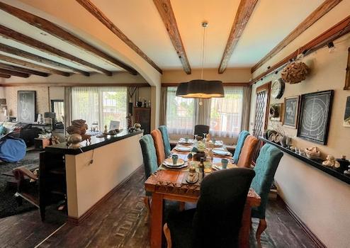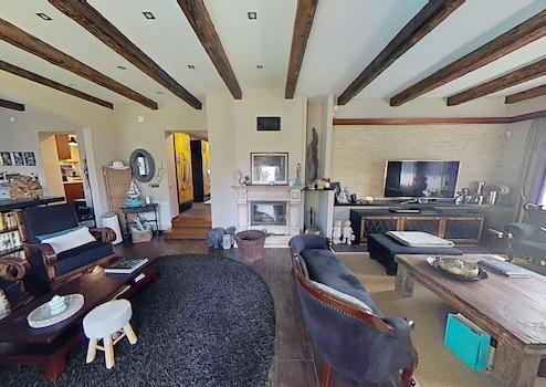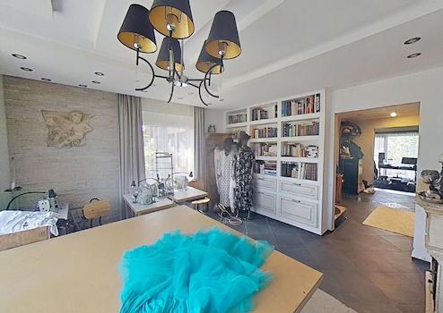 Im Erdgeschoss kann ein wunderschönes 70 m² großes Wohn-/Esszimmer zum Mittelpunkt des Familienlebens werden, mit riesigen Fenstern und einer großen Terrassentür zum Pool/Garten, sodass es zu jeder Tageszeit hell ist. Das Esszimmer bildet einen offenen Raum mit dem Wohnzimmer, ist jedoch durch Möbel und eine einzige Ebene gut von diesem getrennt. Im Erdgeschoss befinden sich zwei weitere große Schlafzimmer (eines davon dient derzeit als Arbeitszimmer, es gibt auch einen funktionierenden Kamin), ein Badezimmer/WC und eine separate Toilette.