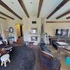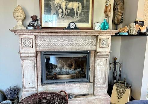 Der von geschickten Händen individuell gebaute Kamin im Wohnzimmer sorgt für winterliche Atmosphäre. (Extra: Der Kamin und die Küchentheke sind aus dem gleichen Stein!)