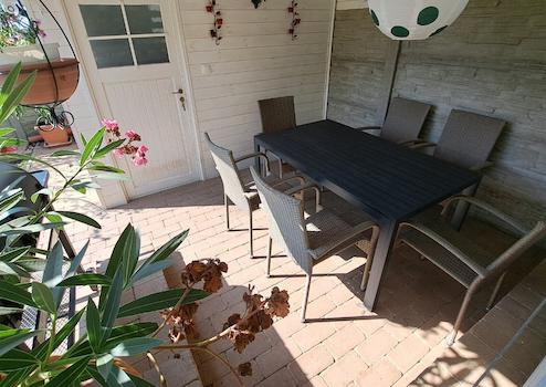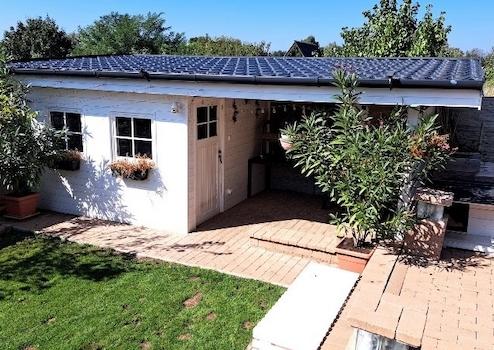 Im Garten wurde außerdem ein isoliertes Holzhaus gebaut, das entweder als Gästehaus, Partyraum oder Lagerraum fungieren kann. Hier wurde auch eine Terrasse geschaffen, die bei schönem Wetter eine hervorragende Gelegenheit für Familienmittagessen und Abendessen mit Freunden bietet.