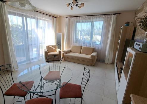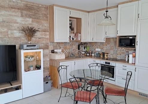 A ház nagyon jó elosztású, az amerikai konyhás nappali mellett 3 hálószoba, fürdő és egy külön mosdó kapott helyet. A konyha teljesen gépesített, minőségi eszközökkel ellátott. Az egész nappali-konyha-étkező rész letisztult és világos. A nappaliból közvetlen kijárat van a teraszra, így az év jó részében a ház teljesen egybeolvadhat a kerttel, megnövelve ezzel a lakóteret. Grillezzen a teraszon miközben a parkosított kertjében, a panorámában gyönyörködik!