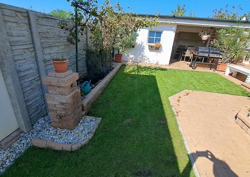 Kert teljesen körbekerített, térkövezett és füvesített, kerti csappal ellátott, továbbá a kert hátsó részében épített magaságyások kerültek kialakításra.
