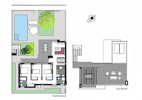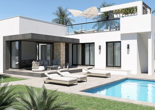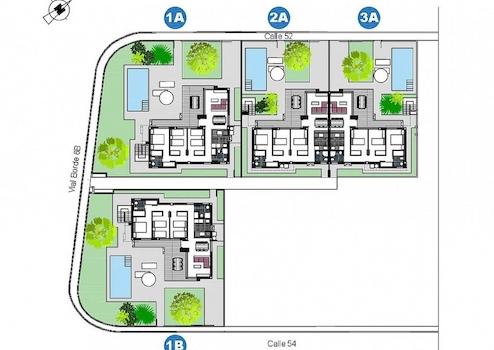 Die Villen werden auf Grundstücken von bis zu 380m2 etwa, mit hochwertigen Materialien gebaut. Die Häuser befinden sich auf einer Ebene mit Terrassen im Erdgeschoss und einer großen Sonnenterrasse im ersten Stock, die es ermöglicht, alle Sonnenstunden zu genießen, jeden Tag des Jahres.