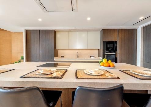 Die Küche ist in den Gemeinschaftsbereich integriert und so konzipiert, dass Sie das Kochen genießen können, während Sie mit Ihren Lieben zusammenleben. Hochwertige Designermöbel aus Holz werden mit
