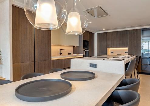 Spitzengeräten von Miele und einer einzigartigen Arbeitsplatte aus Marmor und Porzellan kombiniert. Alles in natürliches Licht getaucht durch die großen Fenster oder den warmen Schein der in die Decke integrierten LED-Strahler im ganzen Raum.