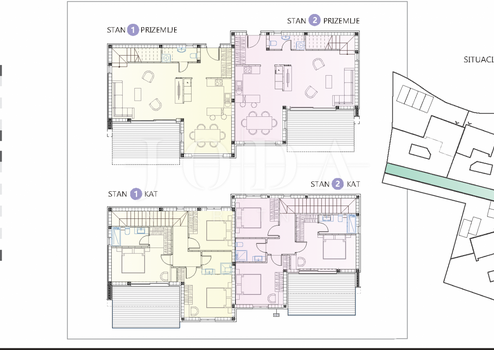 Zu jeder Villa gehören zwei Apartments mit jeweils eigenem Pool und Garten, je nach Apartment zwischen 140 m² und 350 m². Im Erdgeschoss befinden sich ein Eingangsbereich, ein Wohnzimmer mit Esszimmer, eine Toilette, eine Treppe, eine überdachte und nicht überdachte Terrasse mit Swimmingpool. Im ersten Stock gibt es einen Flur, ein Hauptschlafzimmer mit eigenem Bad und großer Terrasse, zwei Doppelschlafzimmer und ein zusätzliches Gemeinschaftsbad.