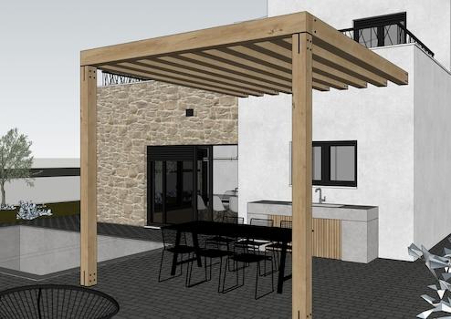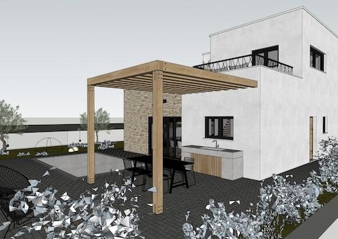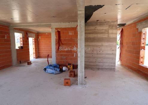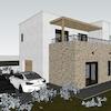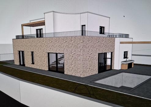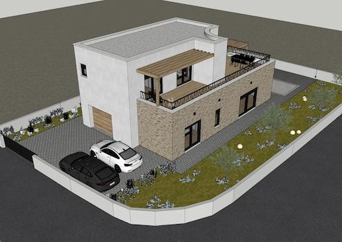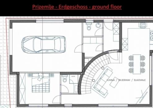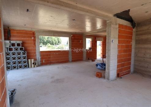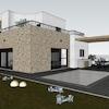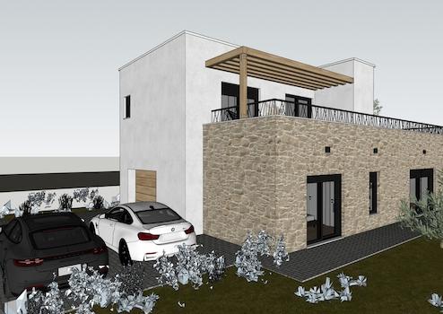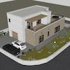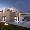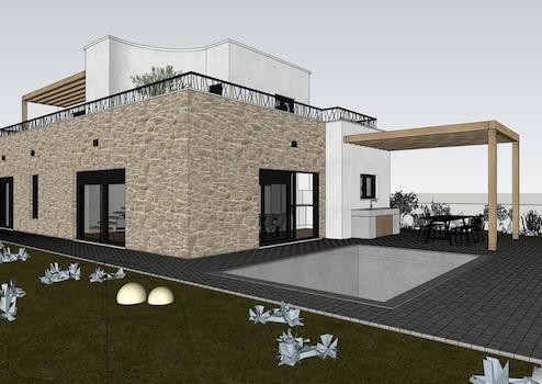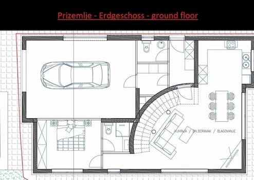 Es besteht aus Erdgeschoss und ersten Stock. Im Erdgeschoss gibt es eine Garage, Flur, Toilette, Schlafzimmer, Badezimmer, Küche-Esszimmer-Wohnzimmer mit Ausgang zur Terrassen mit Pool.
