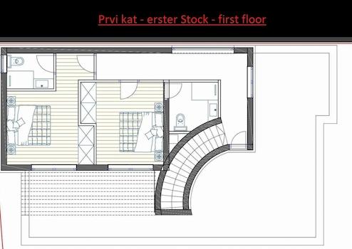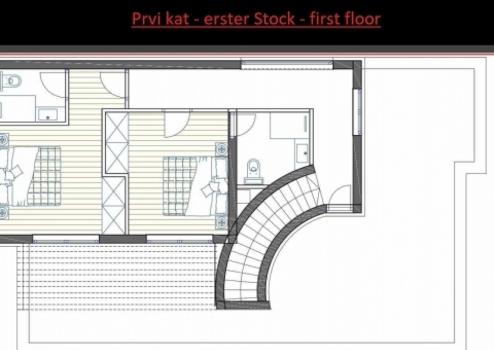 Im ersten Stock befinden sich zwei Schlafzimmer, zwei Badezimmer, ein Flur, großzügige Terrassen mit schöner Aussicht.