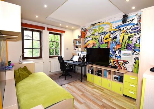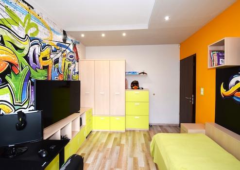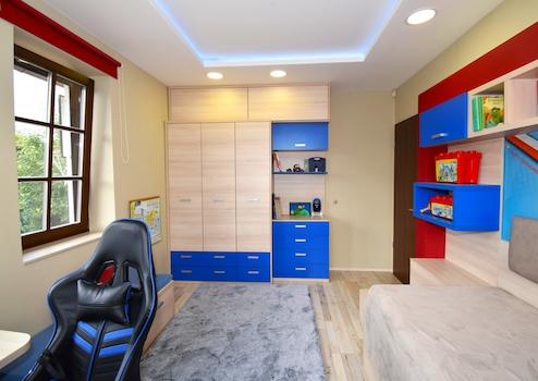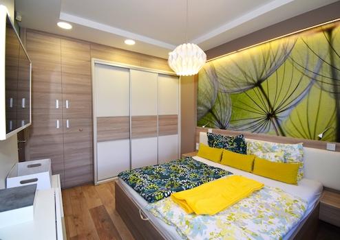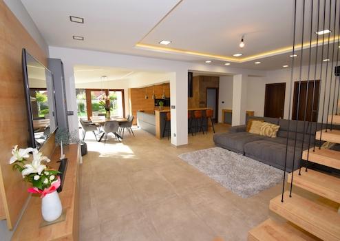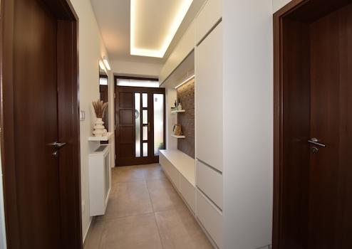 - Burkolatok: magas minőségű járólap, fali panelek, szobákban laminált padló.