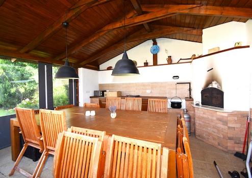 Im Hof gibt es einen überdachten Grill mit Backofen (ca. 20 m2) und einen Abstellraum (ca. 33 m2), in dem sich auch ein Waschbecken und eine Toilette befinden, deren Dach auch bepackt werden kann. Die Gebäude sind umgeben von vielen Zierpflanzen, Sträuchern, einem kleinen Gartenteich, einer wunderschönen Rasenfläche und am Ende des Grundstücks befindet sich ein Gemüsegarten. Das Bewässerungssystem wird über einen Bohrbrunnen betrieben.
