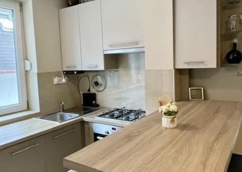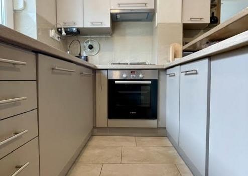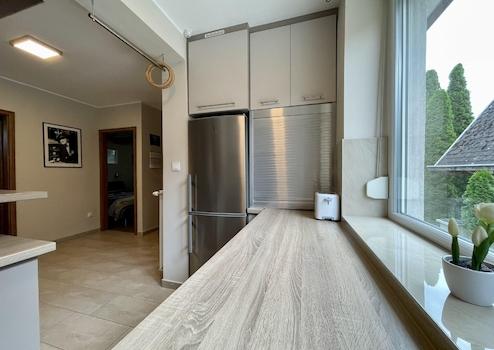 Konyhája egyedi bútorral beépített, gépesített. Elektromos sütő, gáz főzőlap, páraelszívó, 9 terítékes mosogatógép megtalálható benne.