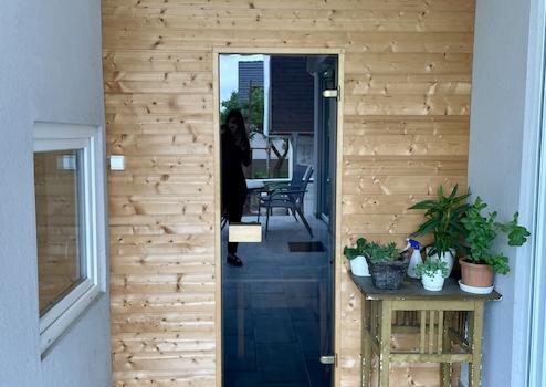 Räume: Flur, Esszimmer-Küche, Wohnzimmer, Schlafzimmer mit Garderobe, Toilette, Heizraum. An der hinteren Vorderseite gibt es einen Terrassenanschluss vom Wohnzimmer, auf dem auch eine Zwei-Personen-Sauna gebaut wurde.