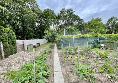 Zöld területe kb. 300 m², jelenleg konyhakert és pihenőkert. Teljes egészében körbekerített, az utcai kapu elektromos mozgatású, gondozott parkosított, hátsó végében erdő található. A telek 30%-ban beépíthető, így még bővítési lehetőséget rejt magában.
