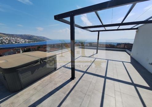 Die Wohnung verfügt außerdem über eine Dachterrasse (72 m2) mit Whirlpool, Dusche und Pergola, die einen außergewöhnlichen Blick auf das Meer und die umliegenden Schären bietet.