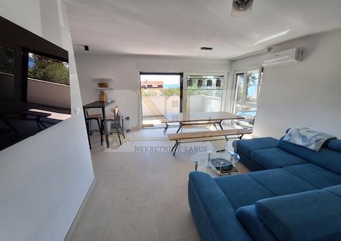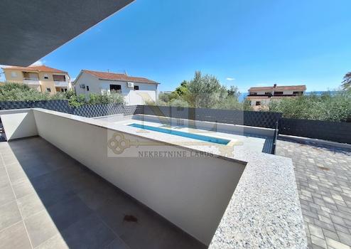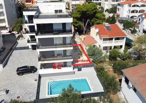Wir verkaufen eine 2-Zimmer-Wohnung im Erdgeschoss mit Garten, Aufzug und Swimmingpool in außergewöhnlicher Lage, 100 Meter vom Meer und dem Strand Okrug Gornji entfernt.