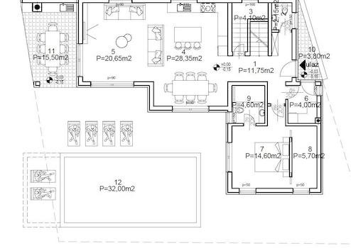 Die Villa besteht aus zwei Etagen. Im Erdgeschoss gibt es eine Küche, ein Wohnzimmer mit Esszimmer, eine Toilette, einen Abstellraum, ein Schlafzimmer mit Kleiderschrank und eigenem Bad, eine Waschküche und zwei Außenterrassen. Auf einer der Terrassen wird es eine Sommerküche geben, während die andere zum 32 m2 großen Swimmingpool führt.