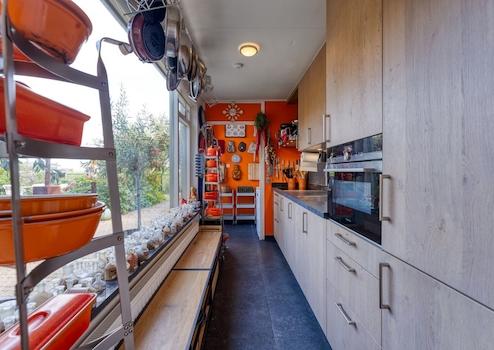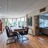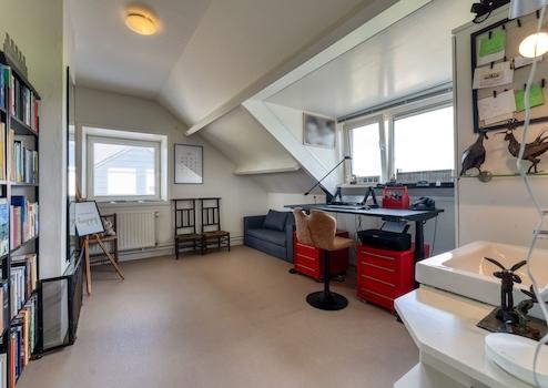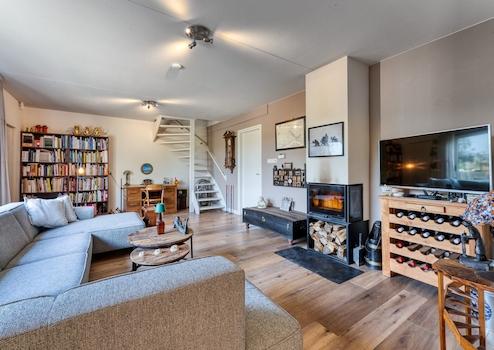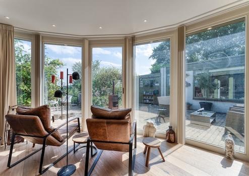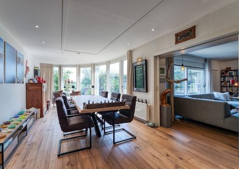 Das Gartenzimmer ist ein schöner, heller Ort mit einer hervorragenden Aussicht auf die Landschaft. Die zylindrischen Fenster verleihen dem Raum einen spielerischen Effekt. Der Raum ist groß genug, um einen großen Esstisch aufzustellen, an dem Sie mit der Familie und/oder Freunden zu Abend essen können. Durch eine eigene Tür gelangen Sie in das Wohnzimmer. Die Räume sind mit Holzböden ausgestattet, was ihnen eine warme Atmosphäre verleiht. Eine Schiebetür öffnet sich auf die Terrasse und den Garten.