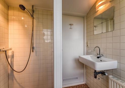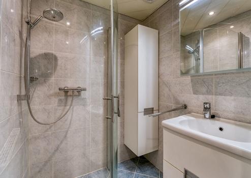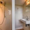 Das Badezimmer ist mit einer begehbaren Dusche, einem Waschbecken und einer Toilette ausgestattet.