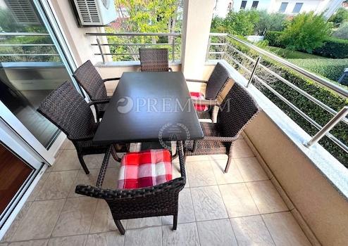 Die Wohnung zeichnet sich durch einen funktionalen Grundriss, ALU-Fenster und -Türen sowie Fußbodenbeläge aus Parkett und Keramik aus. Sie wird möbliert verkauft, wobei die Möbel im Preis enthalten sind.