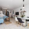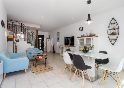 Zum Verkauf steht eine moderne Villa mit einer Fläche von 110,23 m2 (121,03 m2 mit Terrassen) mit einem Garten von 20 m2 und einem Swimmingpool. Die Villa ist die mittlere von drei Villen in einer Reihe.