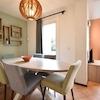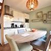 Die offene Küche ist voll ausgestattet und bietet alles, was Sie brauchen. Es gibt eine moderne Kombimikrowelle für die schnelle Zubereitung von Mahlzeiten und einen 4-Flammen-Gasherd für umfangreiches Kochen. Über dem Herd hängt eine elegante Edelstahl-Dunstabzugshaube, die für eine gute Belüftung beim Kochen sorgt. Außerdem verfügt die Küche über einen Geschirrspüler, so dass Sie nach dem Essen schnell aufräumen können. Der Kühlschrank mit Gefrierfach bietet genügend Platz, um alle Ihre Lebensmittel kühl und frisch zu halten.