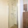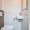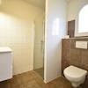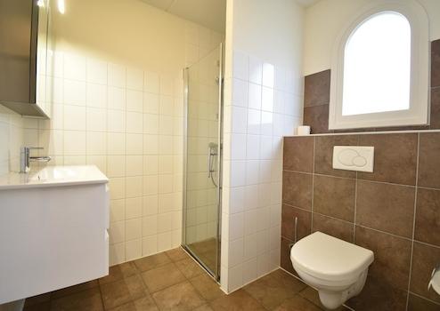 Das moderne Badezimmer verfügt über ein stilvolles Waschbecken mit einem passenden Schrank für zusätzlichen Stauraum. Über dem Waschbecken hängt ein Spiegel, der auch Stauraum für Toilettenartikel bietet. Die geräumige Dusche bietet großen Komfort, während die hängende Toilette dem Raum einen eleganten und minimalistischen Look verleiht. Ein schönes Detail ist das halbrunde Fenster, das für spielerisches Licht sorgt und dem Bad einen einzigartigen Look verleiht.