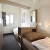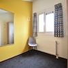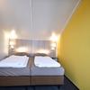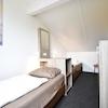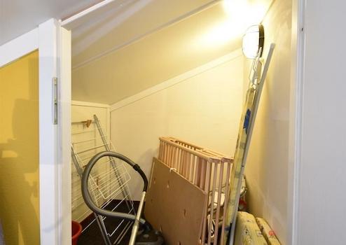 Das Schlafzimmer im Obergeschoss hat zwei Einzelbetten, die ordentlich nebeneinander aufgestellt sind. Der Boden ist mit einem dunklen Teppich ausgelegt, der ein warmes und gemütliches Gefühl vermittelt. An der Seite des Zimmers befindet sich ein Heizkörper, der den Raum gut wärmt. Es gibt auch ein Fenster, das natürliches Licht hereinlässt. Außerdem verfügt der Raum über einen praktischen Abstellraum, der sich ideal zum Verstauen von Dingen eignet.