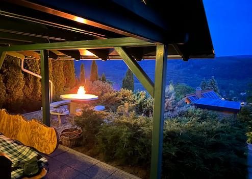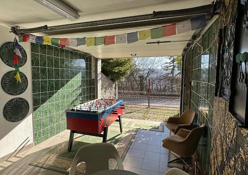 A kert legfelső és legmagasabb részén egy fedett kiülő is van, kiépített grillezési, bográcsozási lehetőséggel.