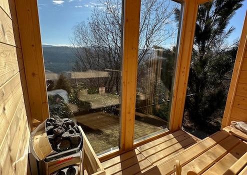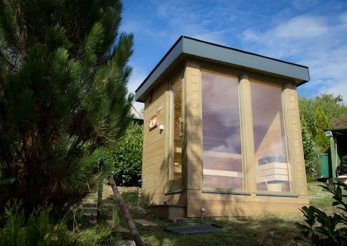 A kertben egy kültéri finn szauna került kialakításra panoráma ablakokkal.