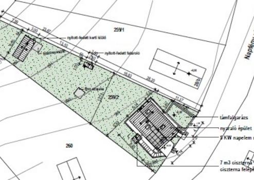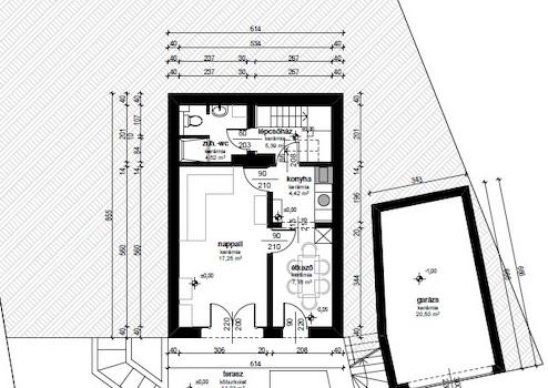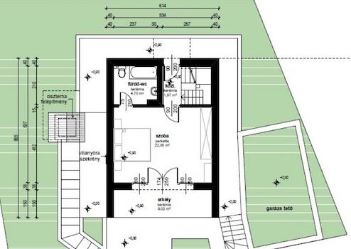 A háztól különállóan egy garázs (20,5 m2) kapott helyet. A garázs teteje füvesített, napozó-pihenő teraszként funkcionál.